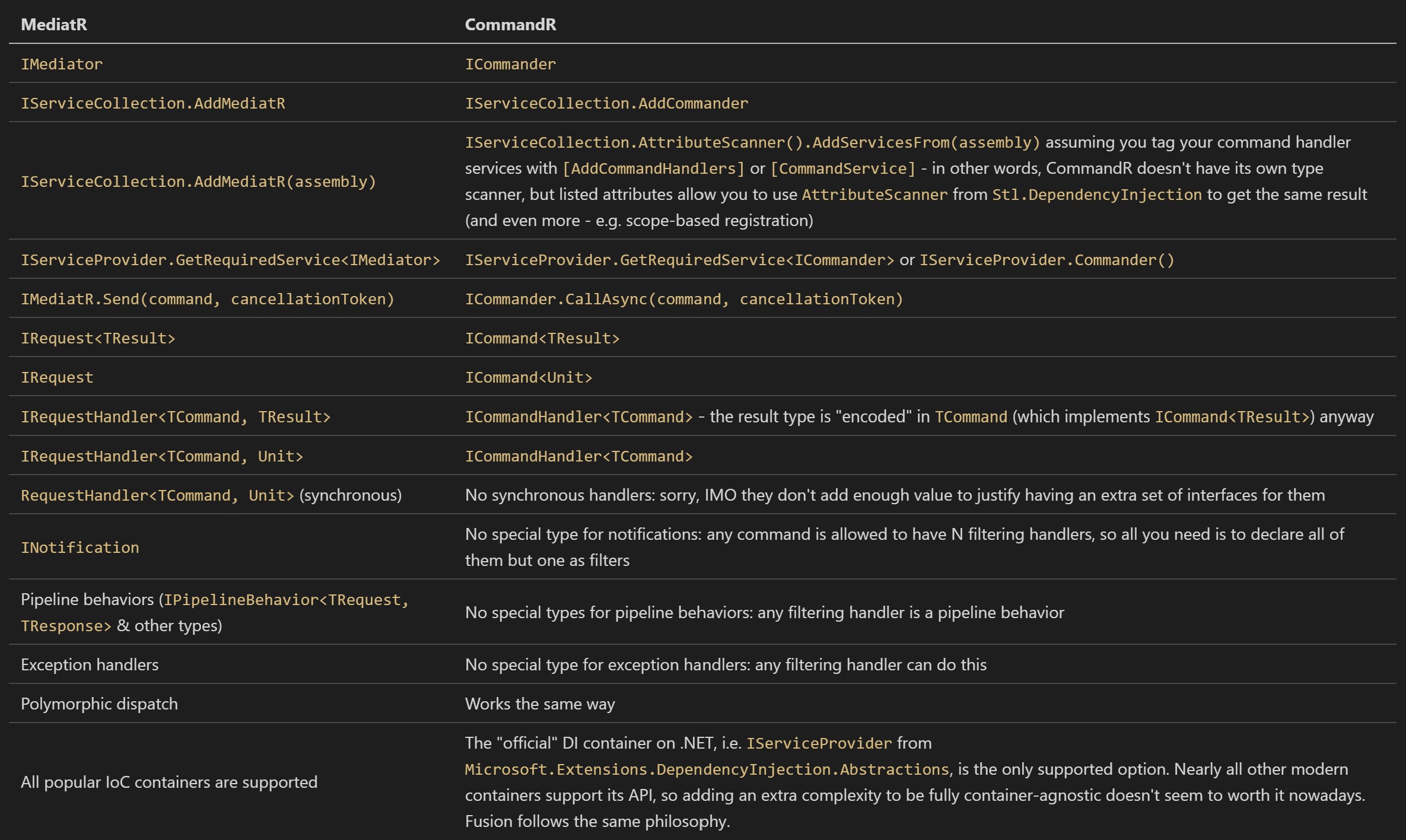 Since many of you are familiar with MediatR, here is the map of its terms to CommandR terms: